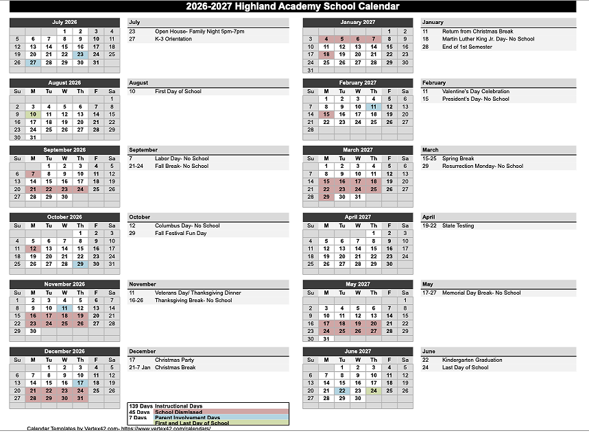 Highland Academy Calendar